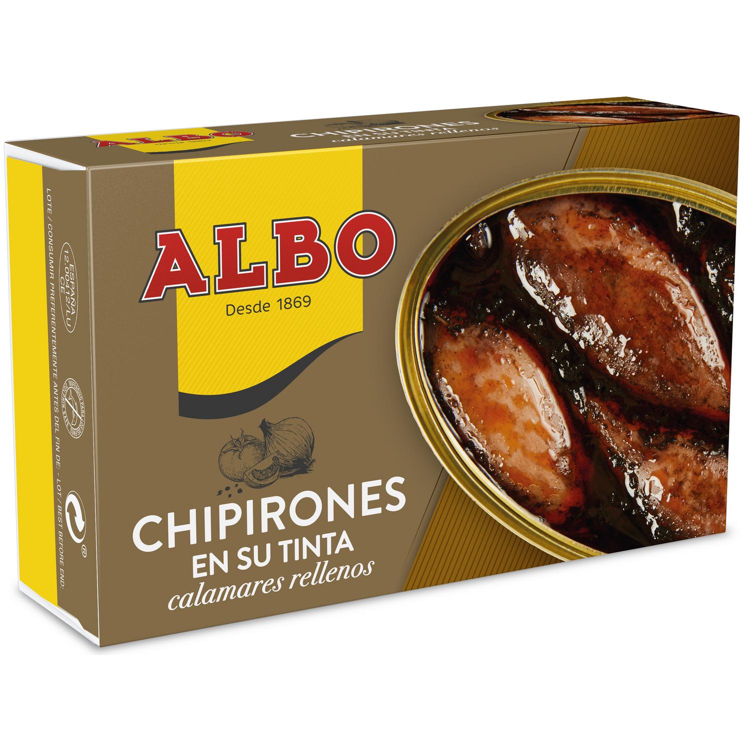 Stuffed squid in its own ink from Albo brand, in a 72g can with easy-open lid. Exquisite and with the quality guarantee of the Albo brand.