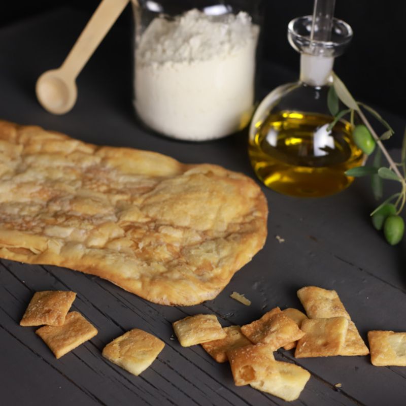 Salt cakes are a typical product of southern Alicante, made solely with flour, olive oil, and salt, forming thin layers of puff pastry. They are then baked until crispy on the outside and tender on the inside.